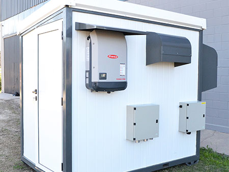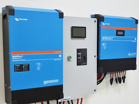 Durante el día la energía generada por los paneles solares abastece los consumos momentáneos y se almacena el excedente en los bancos de baterias de reserva.