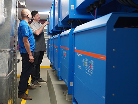 Durante el día la energía generada por los paneles solares abastece los consumos momentáneos y se almacena el excedente en los bancos de baterias de reserva.