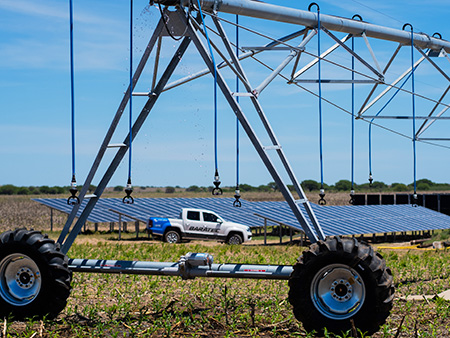 Compuesto por inversores Victron Energy, variadores de frecuencia, baterías X LYTE y una planta solar de aproximadamente 130 kWp, este sistema permite regar entre 80 y 160 hectáreas de manera autónoma.